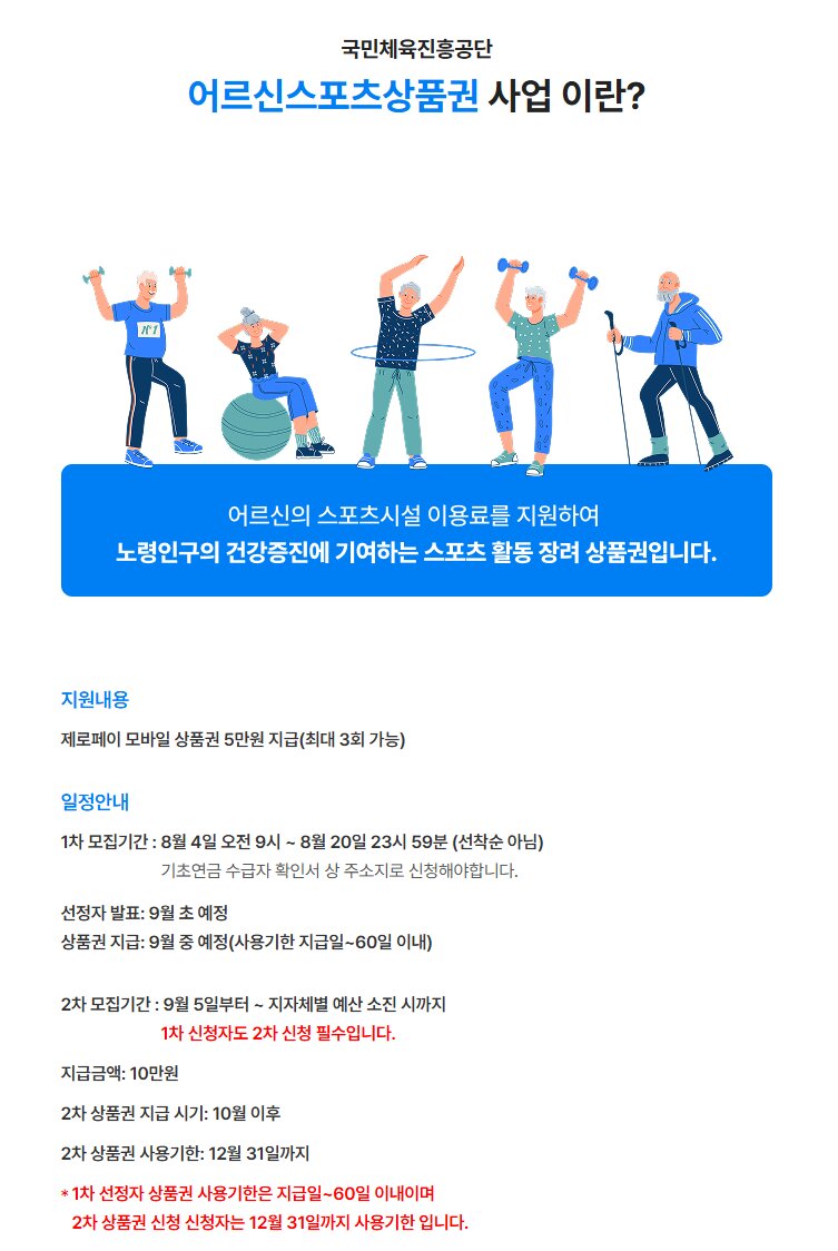 65세 이상 기초연금 수급자를 위한 어르신 스포츠 상품권 2차 신청이 시작되었습니다. 이 사업은 어르신들의 건강 증진과 여가 생활 향유, 나아가 지역 체육시설 활성화를 위해 추진되는 공공 지원 제도입니다. 이번 2차 모집을 통해 신청하면 총 10만원(5만원권 2장) 상당의 제로페이 스포츠 전용 상품권을 지급받을 수 있습니다.